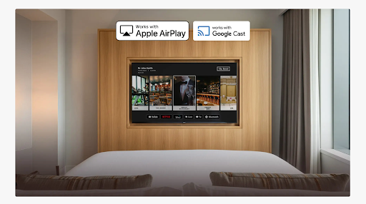 Full IPTV & streaming suite: Guests can watch live channels, on-demand content, and access popular apps like Netflix, YouTube, and music services through seamless casting (Google Cast & Apple AirPlay).